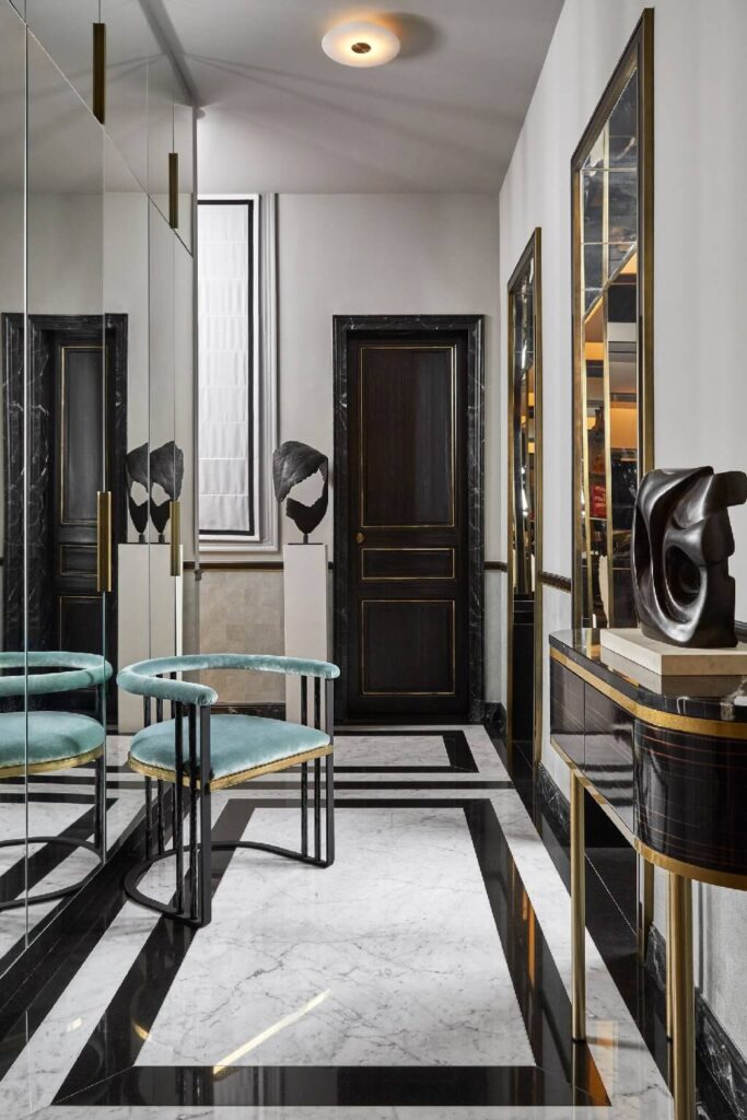 - Luxurious Materials: A mix of classic and contemporary materials such as polished brass, chrome, marble, lacquered wood, and glass are used to convey opulence.