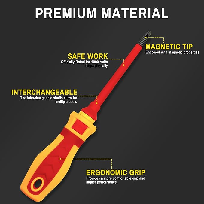 - 𝐐𝐮𝐚𝐥𝐢𝐭𝐲 𝐌𝐚𝐭𝐞𝐫𝐢𝐚𝐥: The 𝗶𝗻𝘀𝘂𝗹𝗮𝘁𝗲𝗱 𝘀𝗰𝗿𝗲𝘄𝗱𝗿𝗶𝘃𝗲𝗿 𝘀𝗲𝘁𝘀 are made of chrome vanadium steel, with all magnetic tips treated with an anti-rust process for long-term use