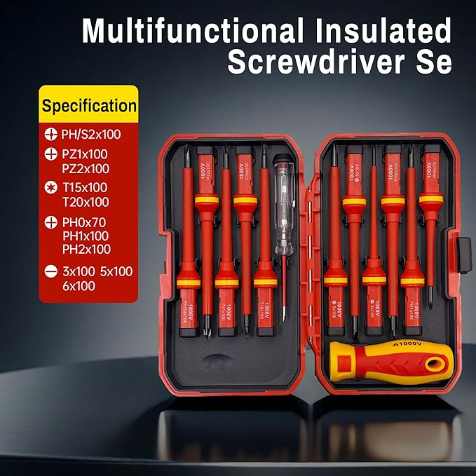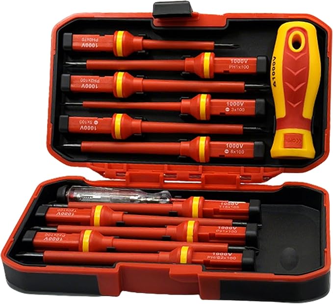- 𝟏𝟑-𝐢𝐧-𝟏 𝐂𝐨𝐦𝐩𝐥𝐞𝐭𝐞 𝐒𝐞𝐭: The insulated 𝘀𝗰𝗿𝗲𝘄𝗱𝗿𝗶𝘃𝗲𝗿 𝘀𝗲𝘁 includes 11 interchangeable screwdrivers (slotted, Pozidriv, Torx, and Phillips screwdrivers), 1 insulated handle, and 1 voltage tester, covering various needs