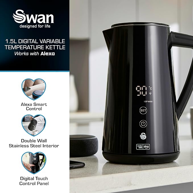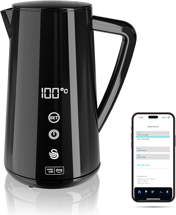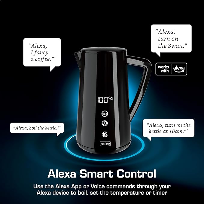 Swan Alexa Smart Kettle, 1.5L Voice-Controlled Kettle with LED Touch Panel, 6 Temperature Settings, Keep Warm Function, Double Wall Insulated, Stainless Steel Interior, Black,